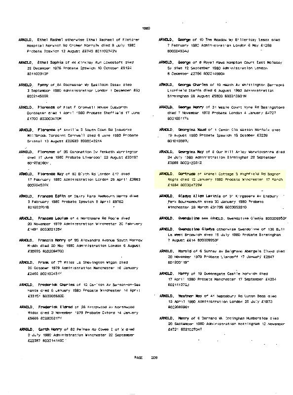 Grant of Probate: Gertrude Arnold, 17 March 1980, Principal Probate Registry, Volume A Page 209.