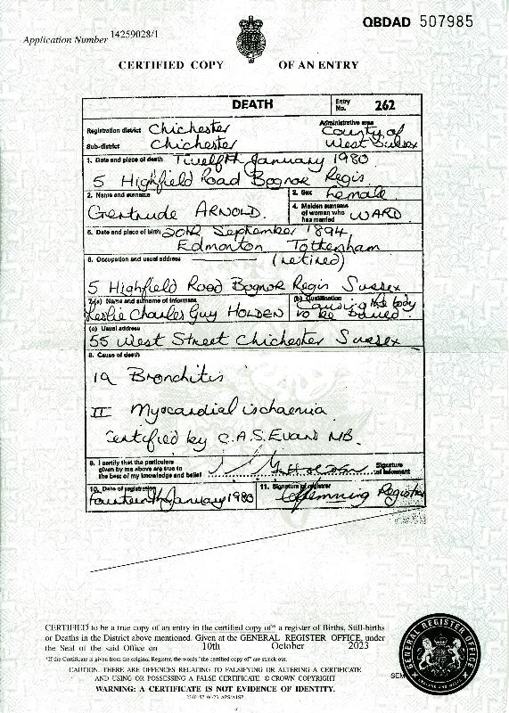 Death certificate of Gertrude Arnold, 12 January 1980, Jack Ward.