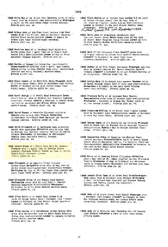 Grant of Probate: Edward brown Isaac, 14 June 1960, Principal Probate Registry, 1060 Page 33.