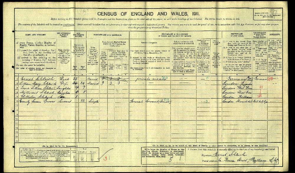 1911 England, Wales & Scotland census, 1a Beira Street, Balham, Streatham, London, RG14/2305, head of household: Ernst Schleich, National Archives.