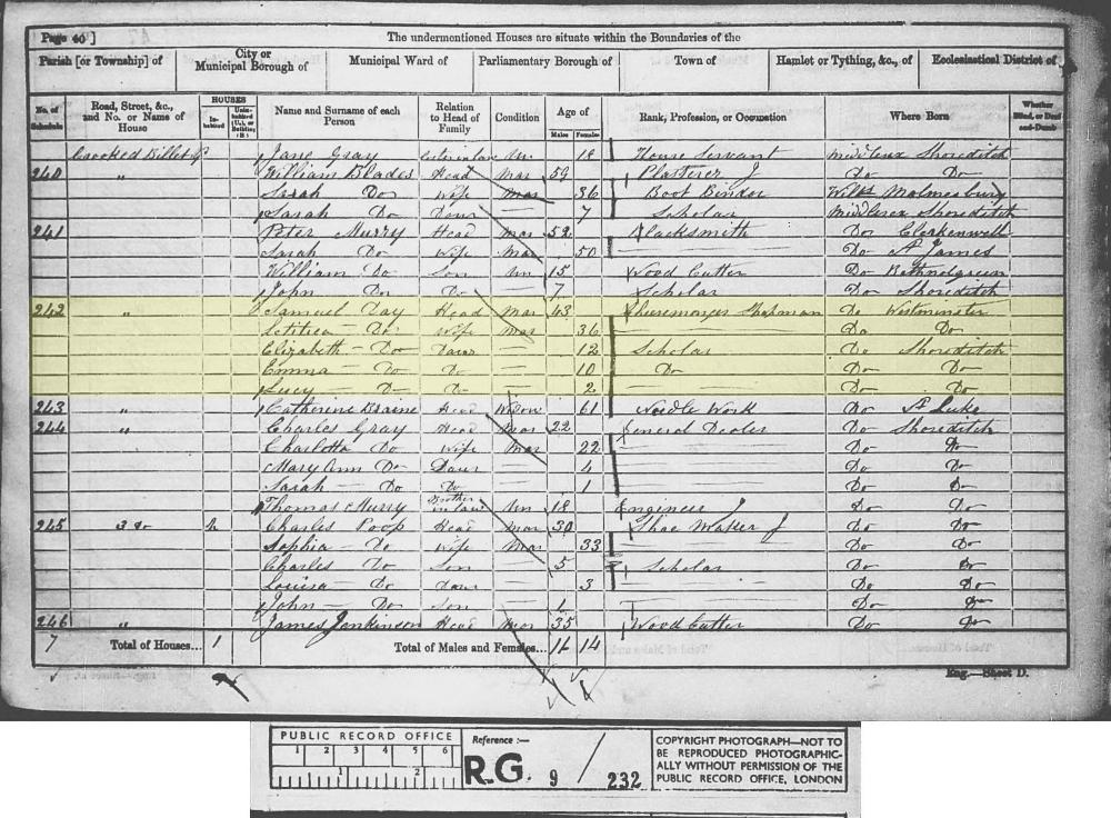 1861 England, Wales & Scotland census, 2 Kingsland Road, Shoreditch, London, RG9/232, Folio 47, Page 40, Schedule 242, head of household: Samuel Day, National Archives.