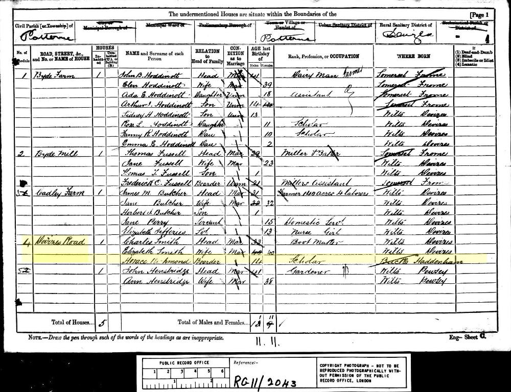 1881 England Census for Charles Smith in Potterne, Wiltshire, (Ancestry image of National Archives RG11/2043; Folio 4; Page 1). Custom Id: RG11/2043, Folio 4, Page 1, Schedule 4; Cit. Date: 3 April 1881. National Archives.