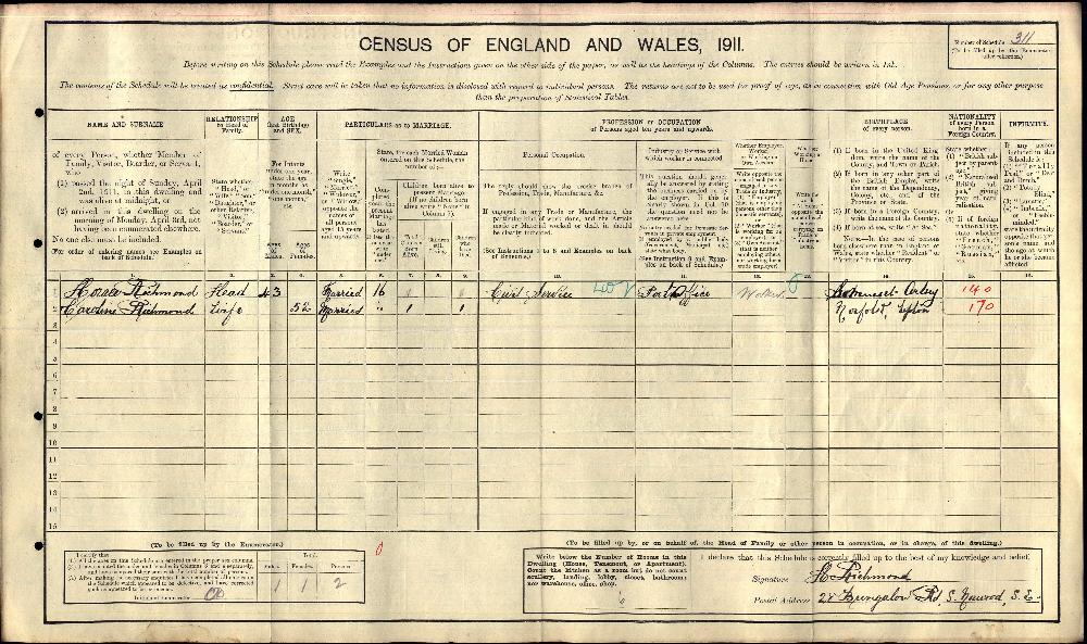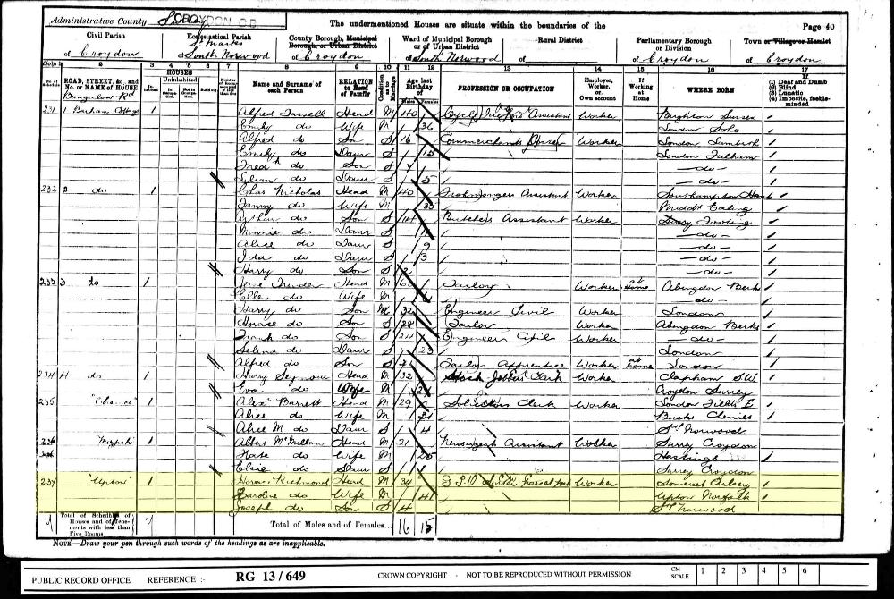 1911 Census for Household of Horace Richmond in Croydon, Surrey, (Ancestry image of National Archives RG14/3381; Registration District 39; Schedule 311). Custom Id: RG14/3381; Registration District 39; Schedule 311; Cit. Date: 2 April 1911. National Archives.