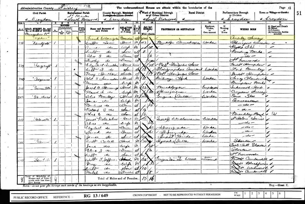 1901 England Census for Family of Horace Richmond in South Norwood, Croydon, Surrey, (Ancestry image of RG13/649: Folio 50; Page 40). Custom Id: RG13/649: Folio 50; Page 40; Schedule 237; Horace Richmond G.P.O. sorter. National Archives. Call Number: 1901 Census.