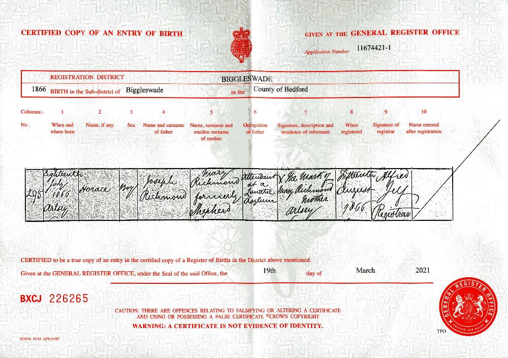 General Register Office, Civil Registration Index (England & Wales) for Birth of Horace Richmond, (Period, Jul-Sep 1866). Quarter and YearJul-Sep 1866SurnameRichmondGiven NamesHoraceRegistration DistrictBiggleswade. General Register Office. Call Number: Births.