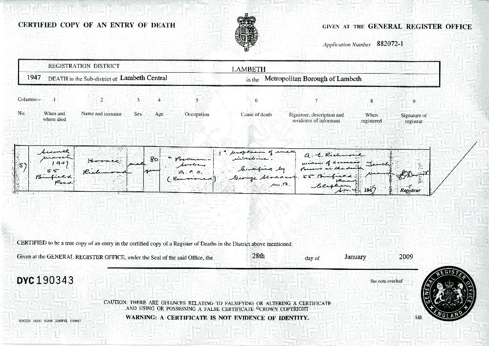 General Register Office, Certified Copy of an Entry of Death for Horace Richmond, (Issued 18 January 2009 by General Register Office Application No. 882072-1). Custom Id: DYC190323; Death of Horace Richmond (9)DistrictLambethCountyMetropolitan Borough of LambethDate of Death7 Mar 1947Place of Death55 Binfield RoadNameHorace RichmondAge80Cause of Death1a Neoplasm of the smallCertified by George Stoddard M.B.Informant's SignatureA.E. RichmondInformant's DescriptionWidow of the deceased. Present at the deathInformant's Residence55 Binfield Road, Clapham, S.W. 4. Jack Ward, The Nook, Silver Street