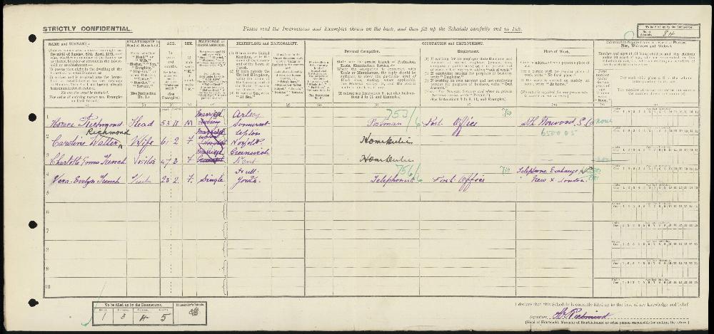 1911 Census for Household of Horace Richmond in Croydon, Surrey, (Ancestry image of National Archives RG14/3381; Registration District 39; Schedule 311). Custom Id: RG14/3381; Registration District 39; Schedule 311; Occupation. Cit. Date: 2 April 1911. National Archives.