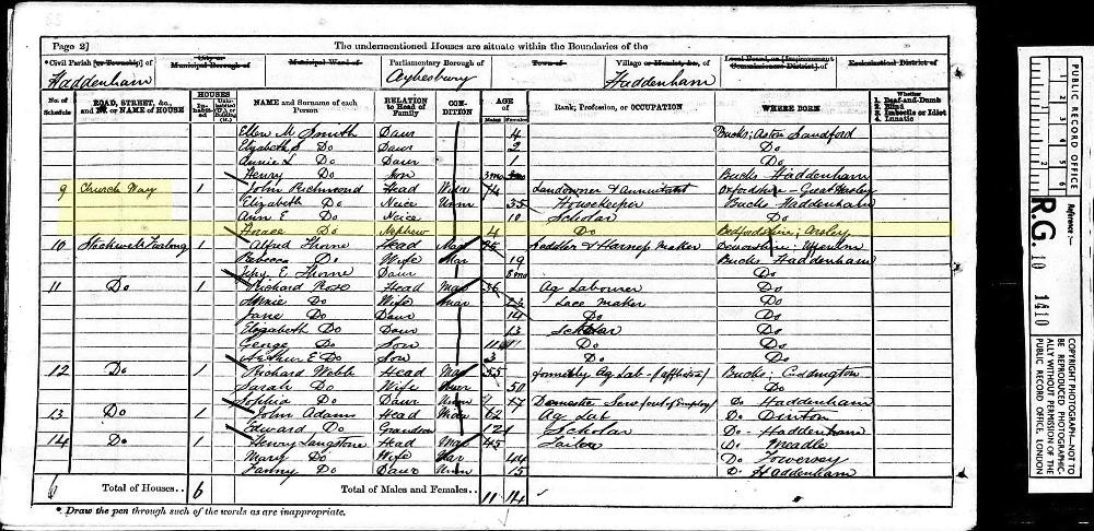 1871 England Census for John Richmond in Haddening, Buckinghamshire, (Ancestry image of National Archives RG10/1410; Folio 23; Page 2 ). Custom Id: RG10/1410; Folio 23; Page 2; Schedule 9; Horace Richmond age 4 born Arlsey, Buckinghamshire. National Archives.