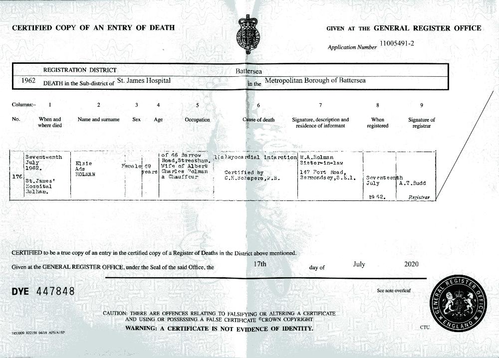 General Register Office, Certified Copy of an Entry of Death for Elsie Ada Holman, (Issued ByGeneral Register Office on 17 Jul 2020 in response to Application No 110055491-2). Custom Id: DYE447848; Cit. Date: 17 July 1952. Pat Ward.