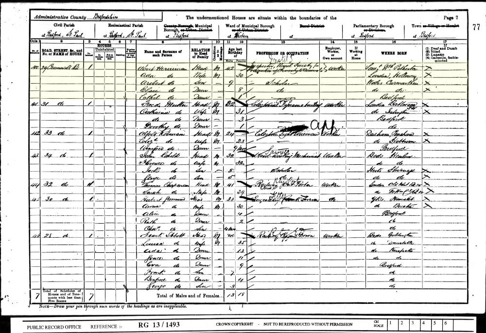 1901 England and Wales census, 29 Cromwell Road, Bedford, Bedfordshire, RG13/1493, Folio 77, Page 7, Schedule 40, head of household: Albert Herniman, National Archives.