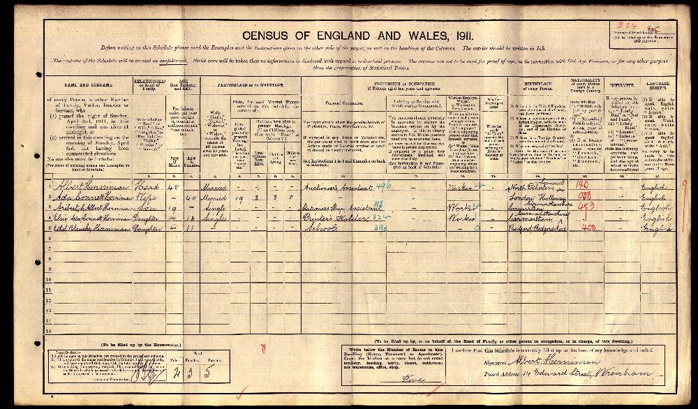1911 England, Wales & Scotland census, 14 Edward Street, Wrexham, Denbighshire, RG14/34069, Schedule 324, head of household: Albert Herniman, National Archives.