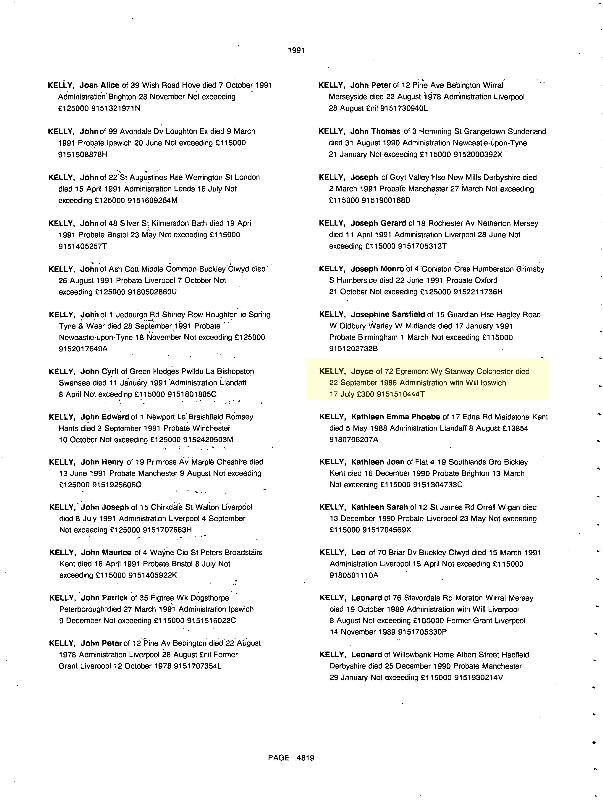 Grant of Administration: Joyce Kelly, 17 July 1991, Principal Probate Registry, Page 4819.