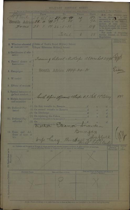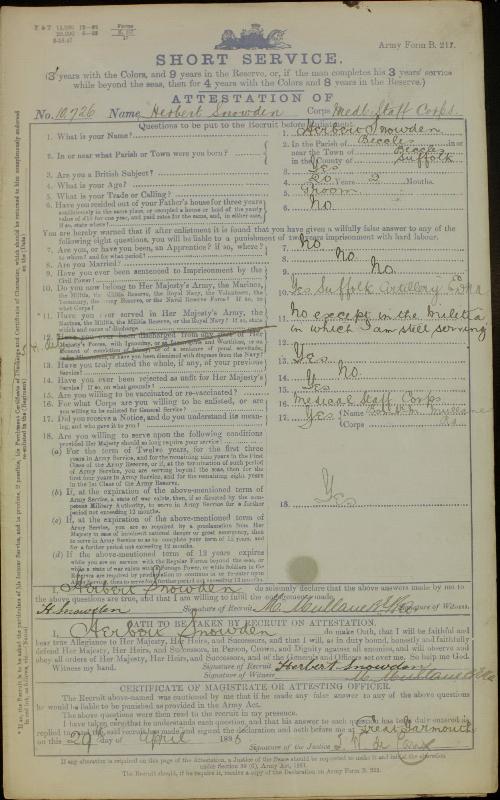 Military Record ( Military History Sheet ) for Herbert Snowden in the Suffolk Artillery (Medical Staff Corps) of the Army. National Archives