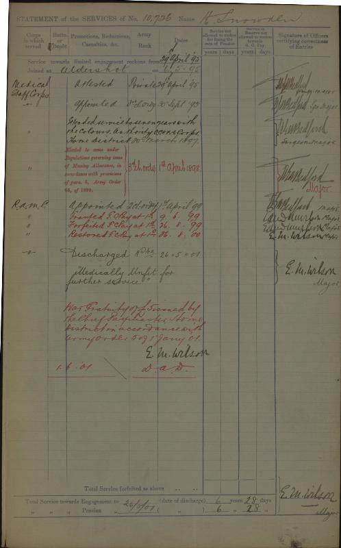Military Record ( Statement of Services ) for H Snowden in the Suffolk Artillery (Medical Saff Corps) and R.A.M.C. of the Army from 29 April 1895 to 26 May 1901. National Archives