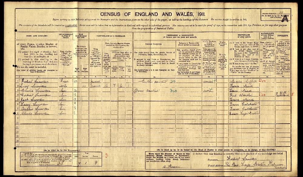 The household consisted of Herbert, his wife Lucy, and their children Brodie (age 14), Herbert (age 12), Jack (age 10), Lacey (age 9), Archie (age ), and Oliver (age 2). They were living in 4 rooms but whether they shared the house or cottage is impossible to tell from the census return.