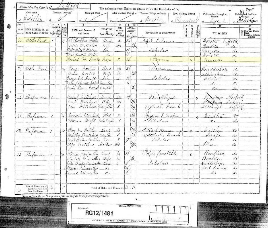 Herbert, who was working as a groom, was lodging with Robert Watson whose household consisted of himself, his wife Jessica, and their children Robert (age 7) and Charles (age 3). They had the cottage which had 4 rooms to themselves.