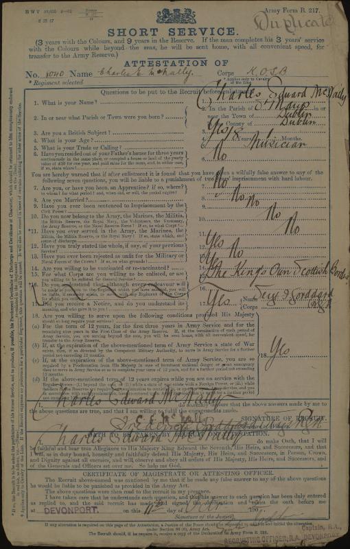 Military Record ( Statement of Service ) for Charles Edward McNally in the King's Own Scottish Borderers of the Army 19 July 1906. National Archives
