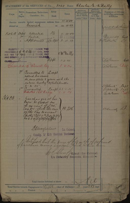 Military Record ( Statement of Service ) for Charles Edward McNally in the King's Own Scottish Borderers of the Army from 11 October 1902 to 19 July 1906. National Archives