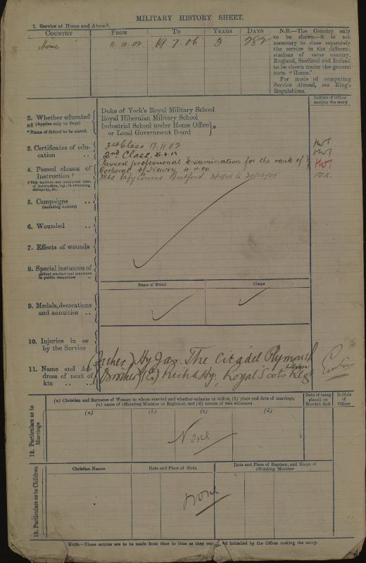 Military Record ( Military History Sheet ) for Charles Edward McNally in the King's Own Scottish Borderers of the Army from 11 October 1902 to 19 July 1906. National Archives