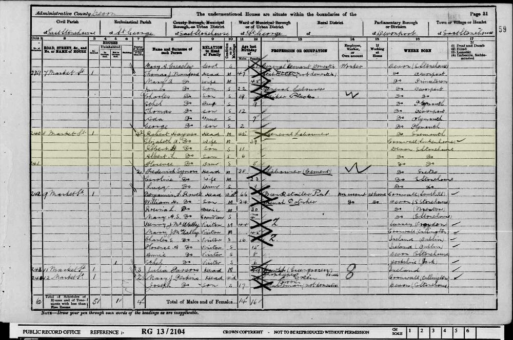 1901 England, Wales & Scotland census, 8 Market Street, East Stonehouse, Devon, head of household: Robert Haymes, National Archives.