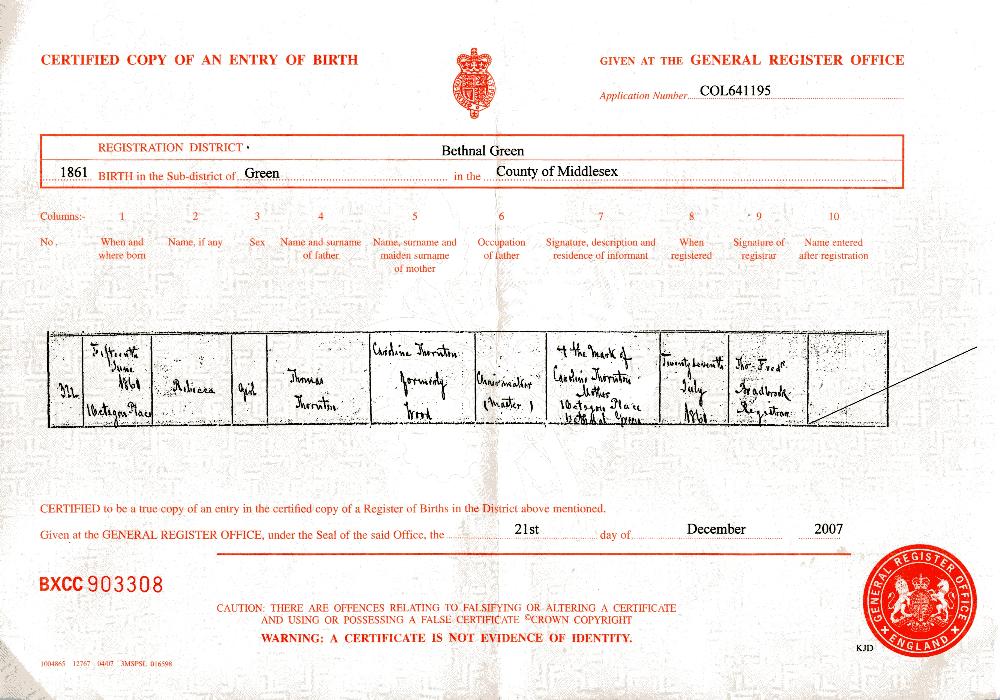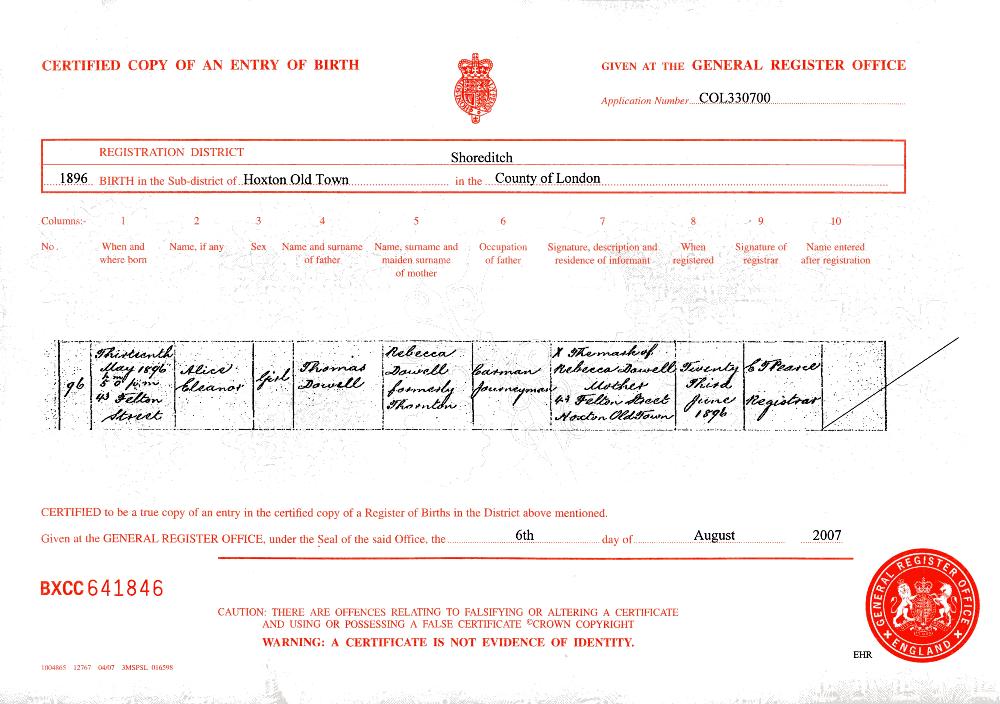 Alice's birth was reported to the Registrar E. J. Pearce by Alice's mother Rebecca on 23 Jun 1896 at the the Register Office for the district of Shoreditch, Middlesex. Her mother registered her twin brother William's birth at the same time.80