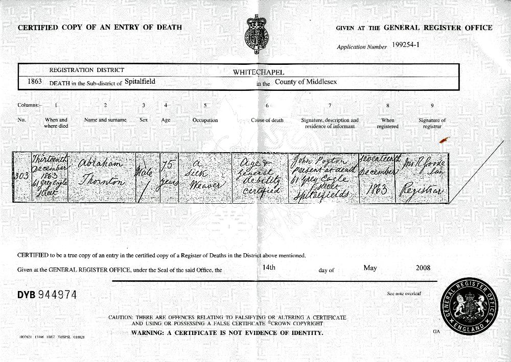 General Register Office, Certified Copy of an Entry of Death for Mary Thornton, (Jack's Certificates). Custom Id: DYB 939272; Date registered. Cit. Date: 7 April 1847. Jack Ward, The Nook, Silver Street