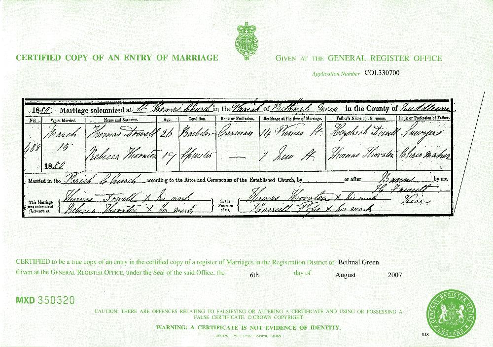 England and Wales Marriage Registration Index, George Thornton and Susannah Abraham, Q3 1864, Bethnal Green, Vol. 1c, Page 683, General Register Office.