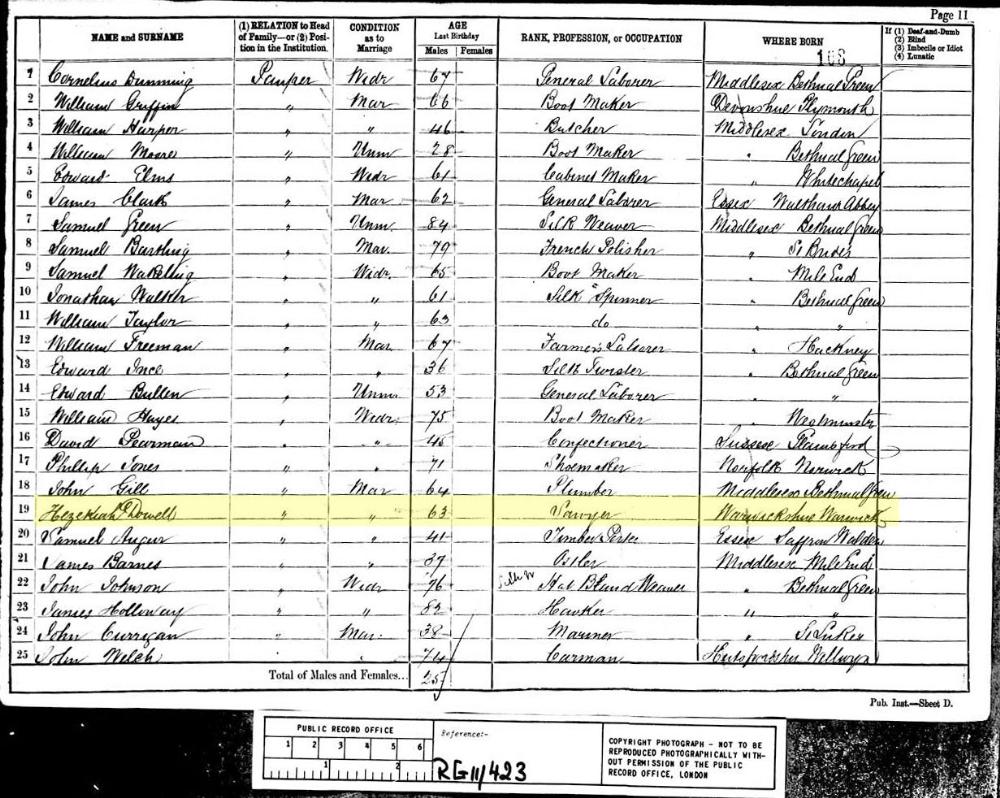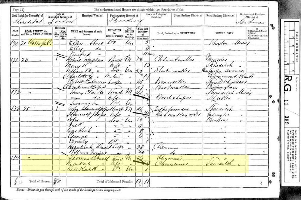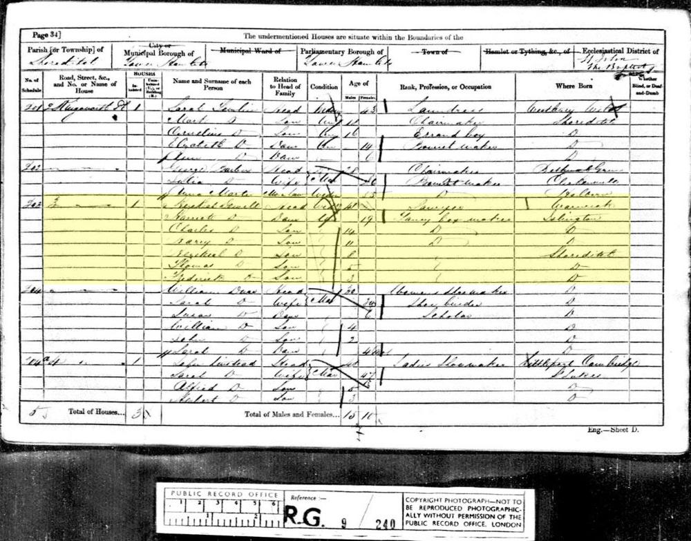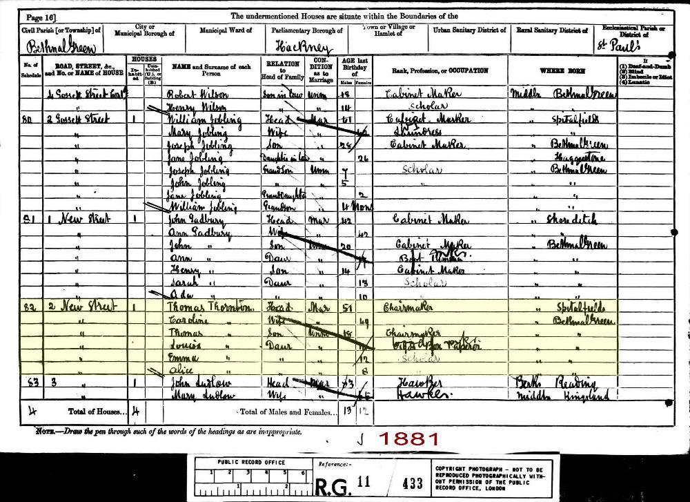 1871 Census for Household of George Thornton in Bethnal Green, London, (Ancestry website). Custom Id: RG10/474, Folio 30, Page 6, Schedule 34; National Archives. Call Number: RG10/474.