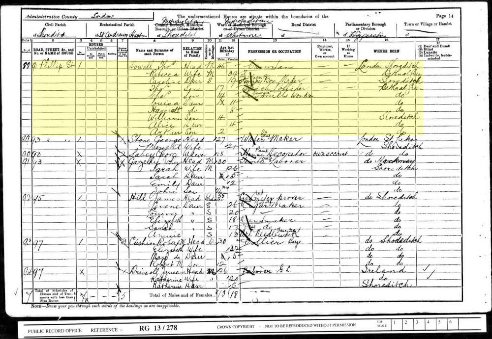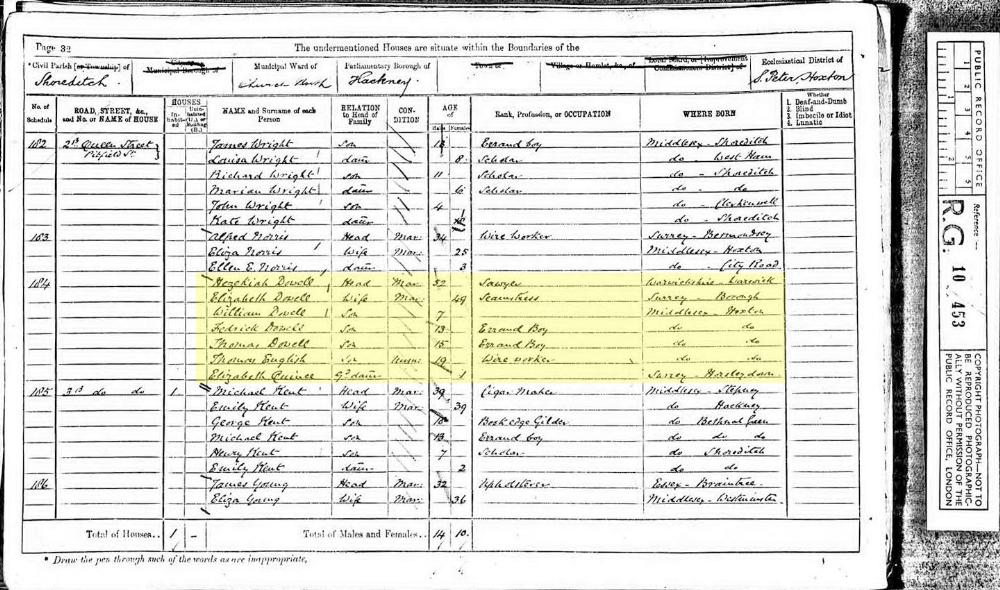 Alice was recorded in the 1901 Census taken on 31 Mar 1901 for Shoreditch as living with her parents Thomas and Rebecca Dowell at 91 Phillip Street. The household consisted of Thomas, his wife Rebecca (née Thornton), and their children Caroline (age 19), Thomas (age 17), Charles (age 14), Louisa (age 11), Harriett (age 8), William (age 4), his twin sister Alice (age 4) and Arthur (age 2). The family had the whole house to themselves although there is no indication as to its size. However, nearby houses in Phillip Street occupied by more than 1 family appear to have 4 rooms so it is assumed that there were 4 rooms probably split up as a living room, the parents bedroom, a bedroom for the boys and a bedroom for the girls. In addition there was probably a scullery with a copper for use on washdays which may also have served as a kitchen and a privy in the yard.87