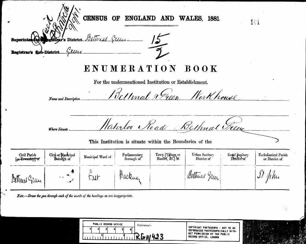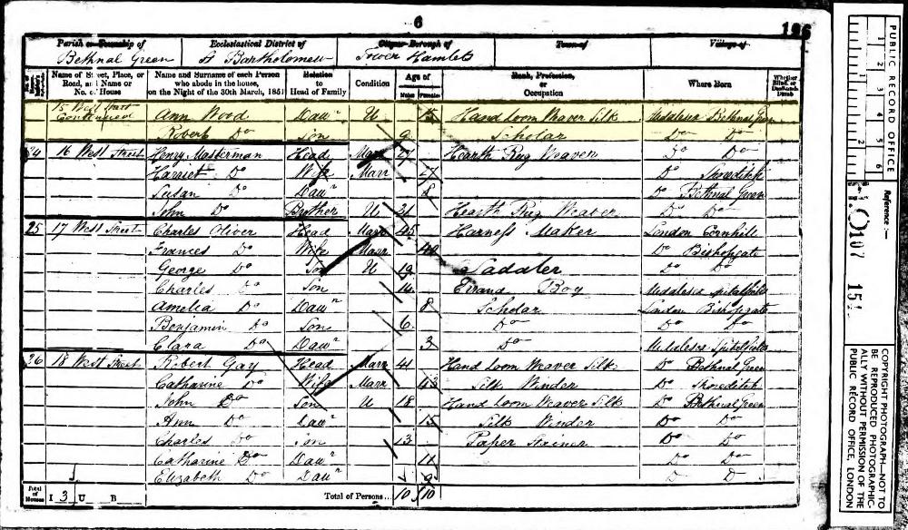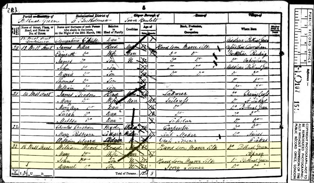 1851 England, Wales & Scotland census, 15 West Street, Bethnal Green, Middlesex, head of household: William Wood, National Archives.