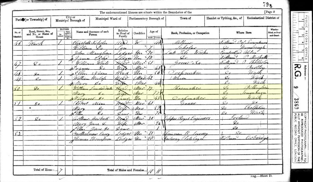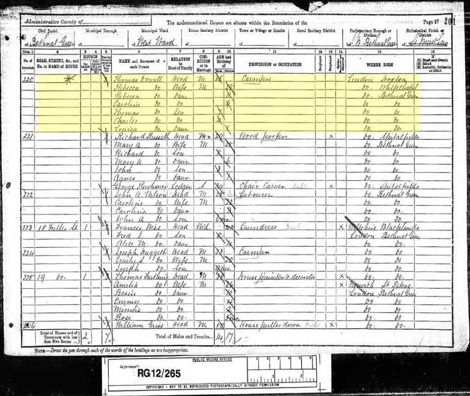 1851 England, Wales & Scotland census, 11 Carters Dent, Stepney, Middlesex, HO107/1544, Folio 247, Pages 59 & 60, Schedule 243, head of household: Sophia Gentleman, National Archives.