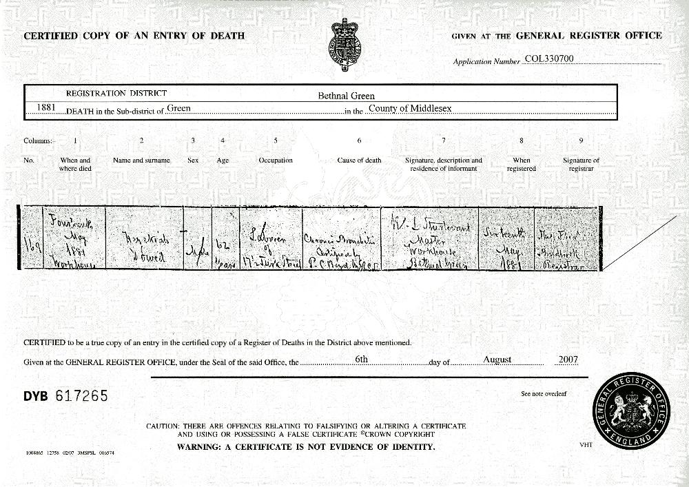 General Register Office, CRI(E&W) for Death of Mary Wood, Event Type: Death, Registration District: Bethnal Green, (FreeBMD website). Custom Id: Deaths Jun 1846 to Mar 1863; CRI(E&W) for Death of Mary Wood (104)Mary appears in the 1841 census but not in any subsequent census. On the assumption that she continued to live in the Bethnal Green area a search of Free BMD gave the following death registrations:-Surname First name(s) AgeDistrictVolPageDeaths Jun 1841WOOD Mary AnnBethnal Gn212 Deaths Mar 1845WOOD Mary AmeliaBethnal Gn243Deaths Sep 1846Wood Mary AnnBethnal Green248 Deaths Jun 1849*Wood MaryBethnal Grn228 Deaths Dec 1850*WOOD MaryBethnal G224 Deaths Sep 1851*WOOD MaryBethnal Gn219*WOOD MaryBethnal Grn2* Deaths Sep 1853Wood Mary AnnBethnal G1c166 Deaths Mar 1854*Wood MaryBethnal G.1c213 Deaths Dec 1856WOOD Mary AnnBethnal Gn1c194 Deaths Jun 1860*WOOD MaryBethnal Gn1c190 Deaths Mar 1861*Wood MaryBethnal Gn1c264 Deaths Mar 1862*WOOD MaryBethnal Gn1c230 Deaths Jun 1862Wood Mary AnnBethnal Gn.1C182Deaths Mar 1863*WOOD MaryBethnal Gn1c224WOOD Mary JaneBethnal Gn1c192 Deaths Dec 1869Wood Mary Ann52Bethnal Green1c246 Deaths Dec 1871Wood Mary67Bethnal Gr. General Register Office.