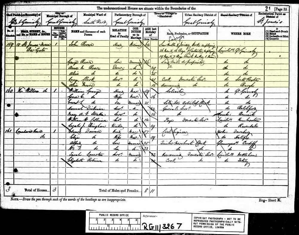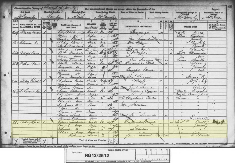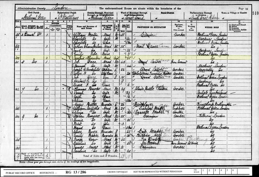 William was recorded in the 1901 Census taken on 31 Mar 1901 for Tottenham, Middlesex as living with his parents William and Gertrude Ward at 3 Cecil Terrace, Park Road. The household consisted of Charles, his wife Gertrude and their children Gertrude (Gertie) and William (Will).163