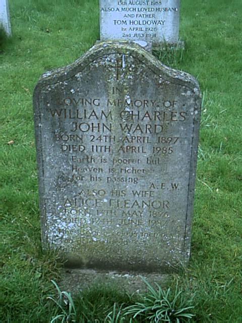 Alice was buried on 24 Jun 1987 in the churchyard of St Mary the Virgin, Limpley Stoke, Wiltshire according to the Church of England rite. The burial was attended by Heather Ann O'Dare [6] and a few of the staff from Waterhouse. The mourners included Jack Peter William Ward [1], Joan Elizabeth Hodge [3], Richard Mark William Ward [4], Ruth Ann Davis [27] and Alison Mary Ward [5]. Her burial service was held at the church of St Mary the Virgin in the village of Limpley Stoke and she was buried with her husband William. There were few mourners; just her son Jack, his wife Heather,and his ex-wife Joan; her grandson Richard (Jack & Joan's son) and his wife Ruth; her granddaughter Alison (Jack & Joan's daughter) and a few of the staff from Waterhouse. Jack wanted to give an address on the life of his mother but Heather forbade it presumably because of the address he had given after Dad’s funeral had made it obvious that he had a good relationship with his parents whereas Heather had a poor relationship with hers. The fact that Jack was unable to give an address was a source of internal sadness as he thought so much of his mother who had been through so much for him. It was just another example of the relationship between Heather and Jack, and the extent to which he would go to keep the peace. A few years later after jack and Heather had been divorced and Jack had married Pat, Pat encouraged him to have an inscription referring to his mother added to the headstone. The added inscription reads: Also his wife Alice Eleanor Born 13th May 1896 Died 17th June 1987 Her life a precious memory Too dearly loved to be forgotten4
