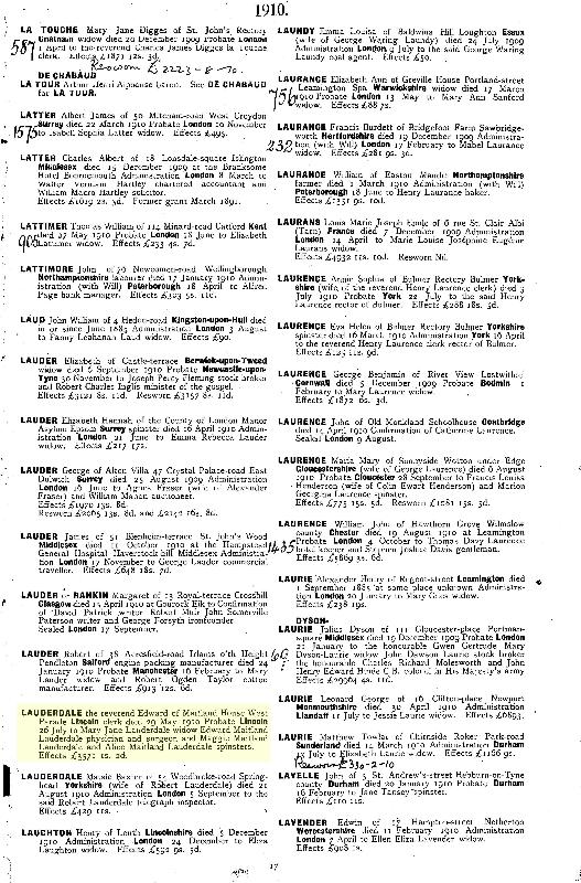 Edward died on 3 Aug 1977 in Bromley Hospital Bromley, Kent from bronchopneumonia and senility. Finding the date of Edward's death was not easy. A search of the death registrations gave an Edward Lauderdale who died in 1977 and was born on 28 July 1881. However, it was known from his birth certificate that he was born on 8 July 1883 and of his full name was Edward Maitland Lauderdale. His last entry in the Medical Directory was in 1977 which gave his home address which was in Maida Vale (by which time he would have been retired as he would have been 94!) whereas the 1964 entry gave his practice address which was in Bermondsey. However, the Medical Directory may be a bit 'historical' - probably at least a year out of date - but did serve to confirm that he had died in 1976 or 7. I asked the GRO to carry out a manual search for the death of Edward Maitland Lauderdale and they couldn't find it neither was his death registered in Scotland, Northern Ireland or abroad but at his age it is unlikely that he would have travelled very far. A search for a birth registration for an Edward Lauderdale born in 1883 proved negative so it is assumed that an error had been made in Edward Maitland Lauderdale's death registration -- probably because the person registering death was not aware of his full name or his date of birth. Although his death certificate was issued in the name of Edward Lauderdale it gave his occupation as a doctor of medicine (retired) which indicated that the correct certificate had been obtained especially as there was no medical registration for an Edward Lauderdale. As a contributory cause of his death was senility it is assumed that he was in a nursing home before he was taken to hospital and that the person who registered his death (David Gareth Jones) as the occupier (a term which is used for the official from the institution reporting the death) was either the owner or an employee of the home. The death was certified by Anthony G Loss who was the deputy coroner for London Southern district after a post-mortem without inquest which means he had not seen a doctor in the 14 days prior to his death.77 Edward's death was reported to the Registrar Eileen R. Dedman on 4 Aug 1977 by David Gareth Jones at the the Register Office for Bromley District. David Jones was either the owner or employee of the nursing home where he lived before being taken into hospital. Probate on the estate of Edward Maitland Lauderdale of London was granted on 1 Dec 1977 at the High Court of Justice Probate Registry. Probate was granted to his solicitor John Simon Gold and his niece Phyllis Mary Walker. After various small bequests the residue of his estate went to his sister Alice. The gross value of his estate was £31, 585 with a nett value of £30,753.78 79 |