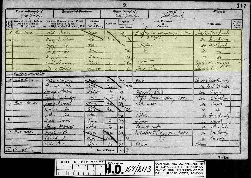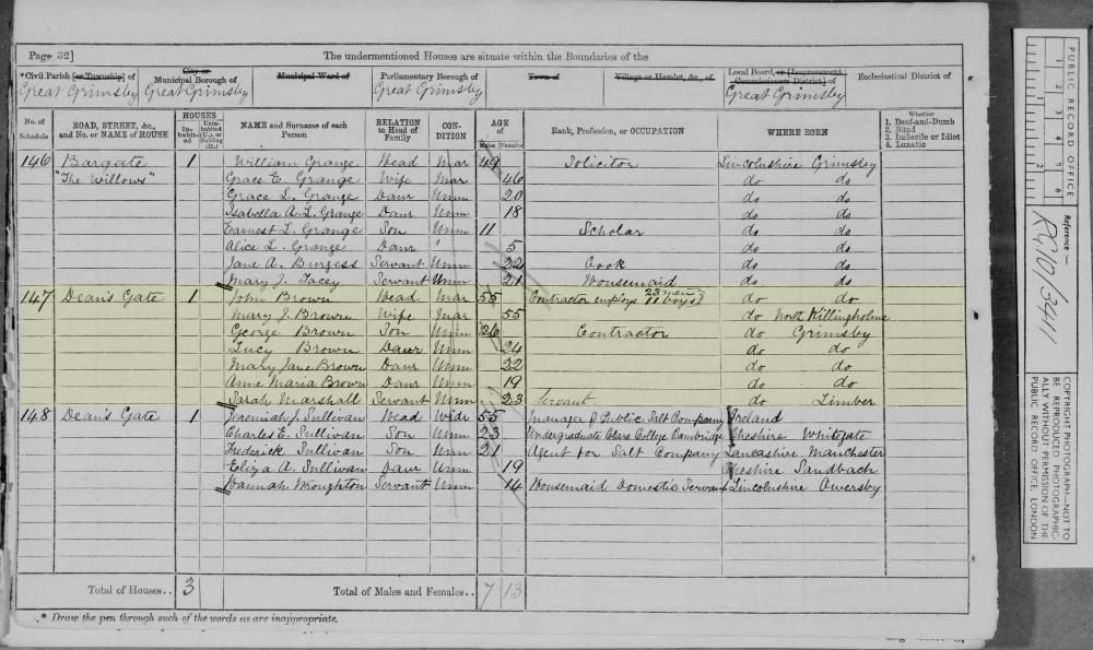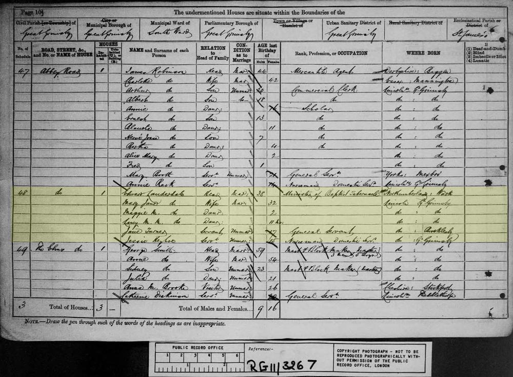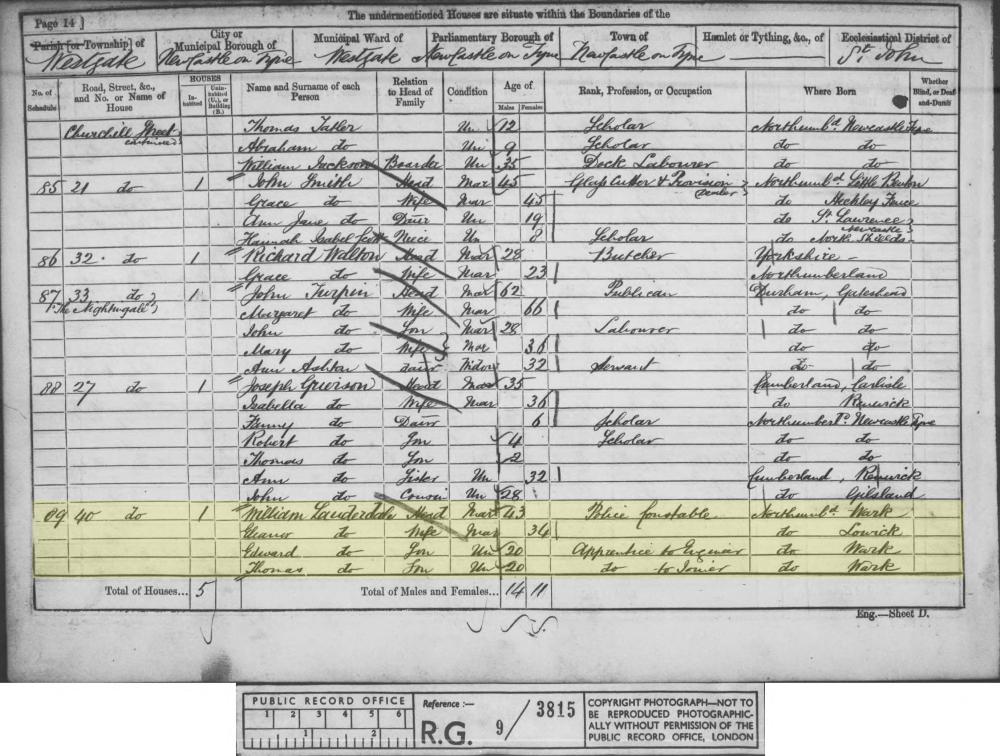 Edward was recorded in the 1891 Census taken on 5 Apr 1891 for Great Grimsby, Lincolnshire as living with his parents Edward and Mary Lauderdale at Abbey Road. The household consisted of Edward, his wife Mary, their two children Edward age 7 and Alice age 4. They also had a general servant Alice Williamson. The size of the house is unknown but it must have been fairly substantial and in an affluent area as most properties had at least one servant. Both the children are attending school.53