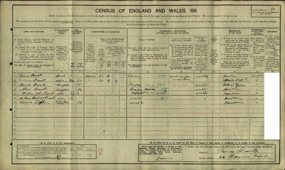 Alice was recorded in the 1911 Census taken on 2 Apr 1911 for Bethnal Green as living with her parents Thomas and Rebecca Dowell at 26 Baroness Road. The household consisted of Thomas and his wife Rebecca, their children Harriett, Alice, William, and Arthur, and Herbert Dowell, and their granddaughter Louise Fippen. Thomas, Harriett, Alice and William were all working whilst Arthur and Louise were at school. Although Louise Fippen is shown as the granddaughter of Thomas Dowell technically she was his step-granddaughter. Louise was the daughter of Thomas Fippen and Louise Jane Dorsett who died on 19 July 1901 of tuberculosis of the brain. Thomas Fippen then married Caroline Emma Dowell a daughter of Thomas and Rebecca on 2 Nov 1902, and they went on to have five children of their own. When Louise came to live with the Dowells is not known - probably shortly before or after Louise Dorset's death because Rebecca had promised to take Louise in if anything happened to her mother. Louise never married and continued to live with Rebecca or after she died Alice. As children Louise and Alice shared a bedroom and had to turn the mangle together on washdays. The return was probably filled in by Thomas' daughter Harriet as both Thomas and his wife Rebecca were illiterate. Thomas added his mark X after his name in the signature box. She was working as a cracker maker. Why she had nor been apprenticed like her siblings is not known. Perhaps she was already showing an inclination towards the religious life.96 97 98