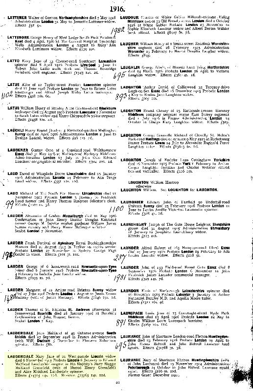 Edward was a beneficiary of the will of his mother Mary Jane Lauderdale on 6 Jan 1916 in Lincoln. The estate was worth £13,765 14s. 11d. which was a considerable sum at that time. At the time of her death she was living in a 10 roomed house.73