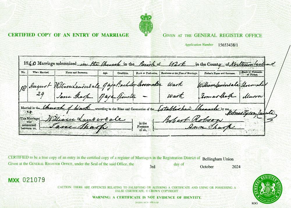 Edward witnessed the marriage of Sherod Henry Greenfield [1046] and Maggie Maitland Lauderdale [21] on 5 Jul 1911 in St Martin's Church Lincoln, Lincolnshire. The other witnesses were C. Greenfield, M. A. Greenfield and Alice Maitland Lauderdale [23] and the service was taken by the Rev. E. Akenhead, Vicar. Unusually there were four witness. Two from the groom's family C. Greenfield and M. A. Greenfield who were probably siblings and two from the bride's family - her brother Edward and her sister Ann. The bride's mother Mary was almost certainly there but who else is not known.68 69